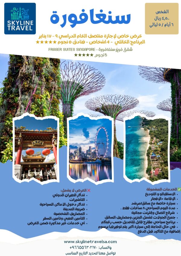الرئيسية / باكيجات الرحلات الخاصة / سنغافورة – عرض خاص لإجازة منتصف العام الدراسي ٦ أيام / ٥ ليالي- يناير ٢٠٢٦ (يشمل ٤ أشخاص) فندق ٥ نجومباكيجات الرحلات الخاصة سنغافورة – عرض خاص لإجازة منتصف العام الدراسي ٦ أيام / ٥ ليالي- يناير ٢٠٢٦ (يشمل ٤ أشخاص) فندق ٥ نجوم 18.000,00 ر.س