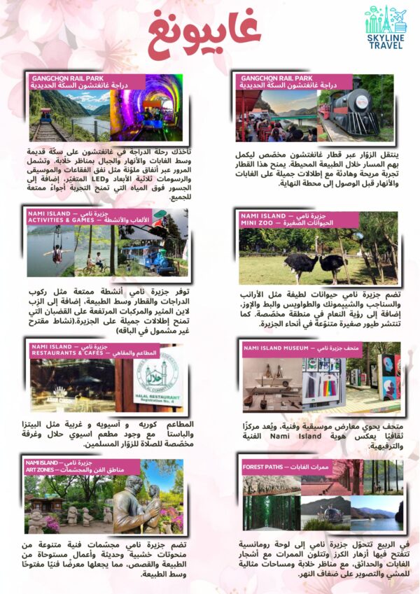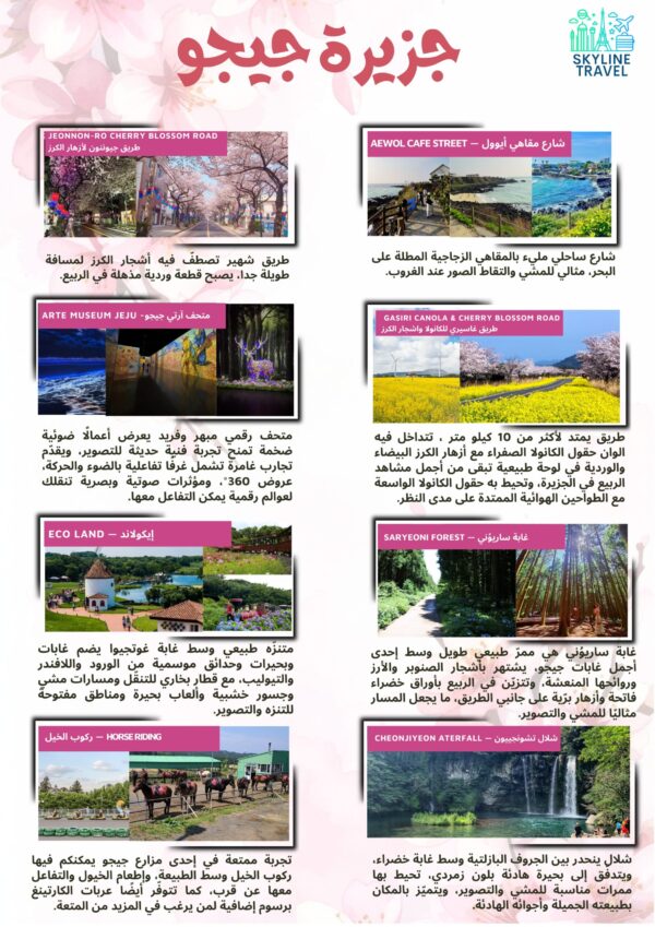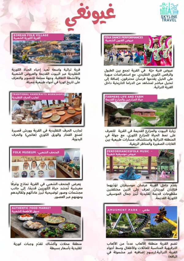 اكتشفوا جمال كوريا في فصل الربيع واستمتعوا بسحر الطبيعة الكورية، وأشجار الكرز المتفتّحة، والمغامرات والتجارب الفريدة التي ستصنع لكِ ذكريات لا تُنسى.