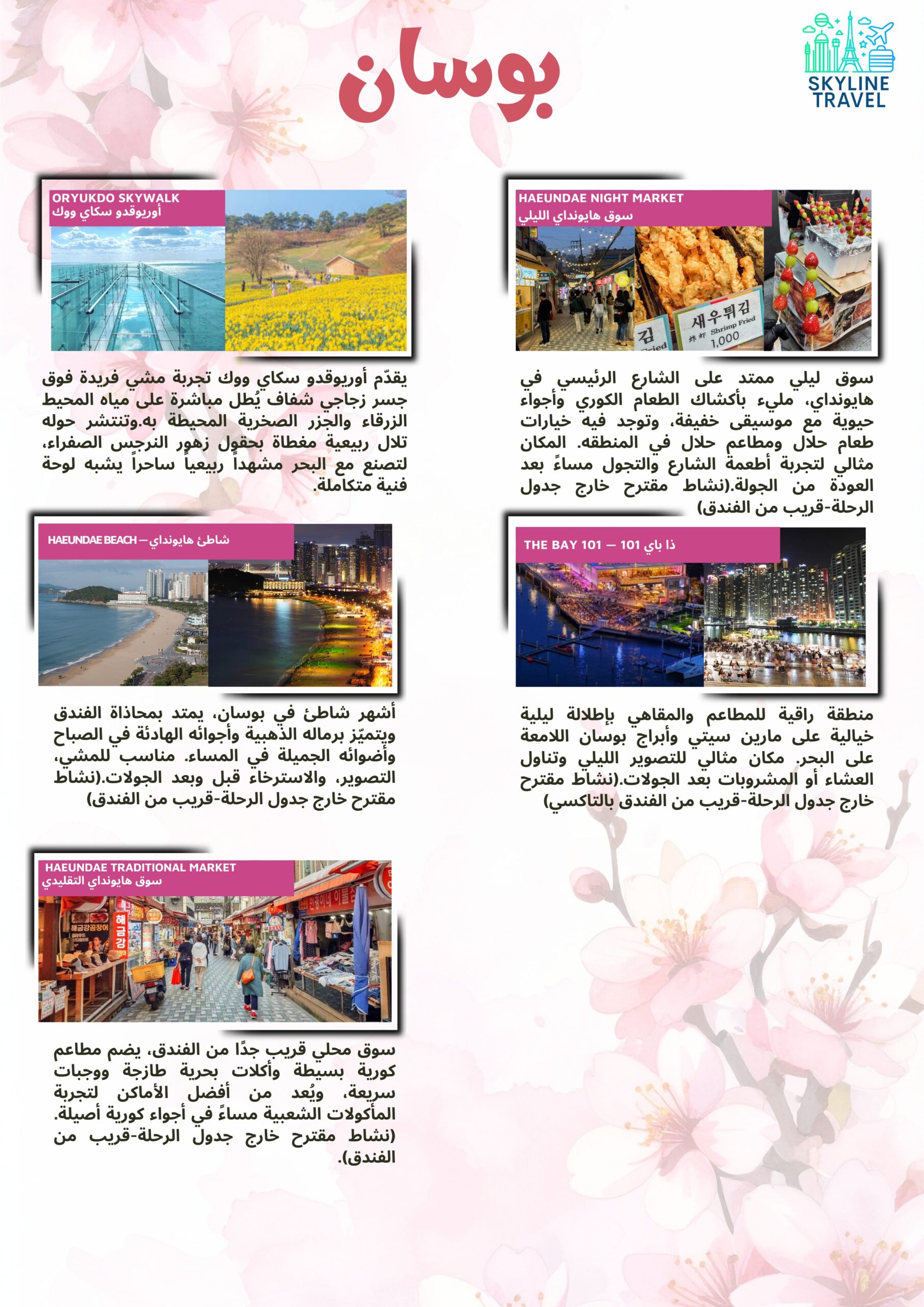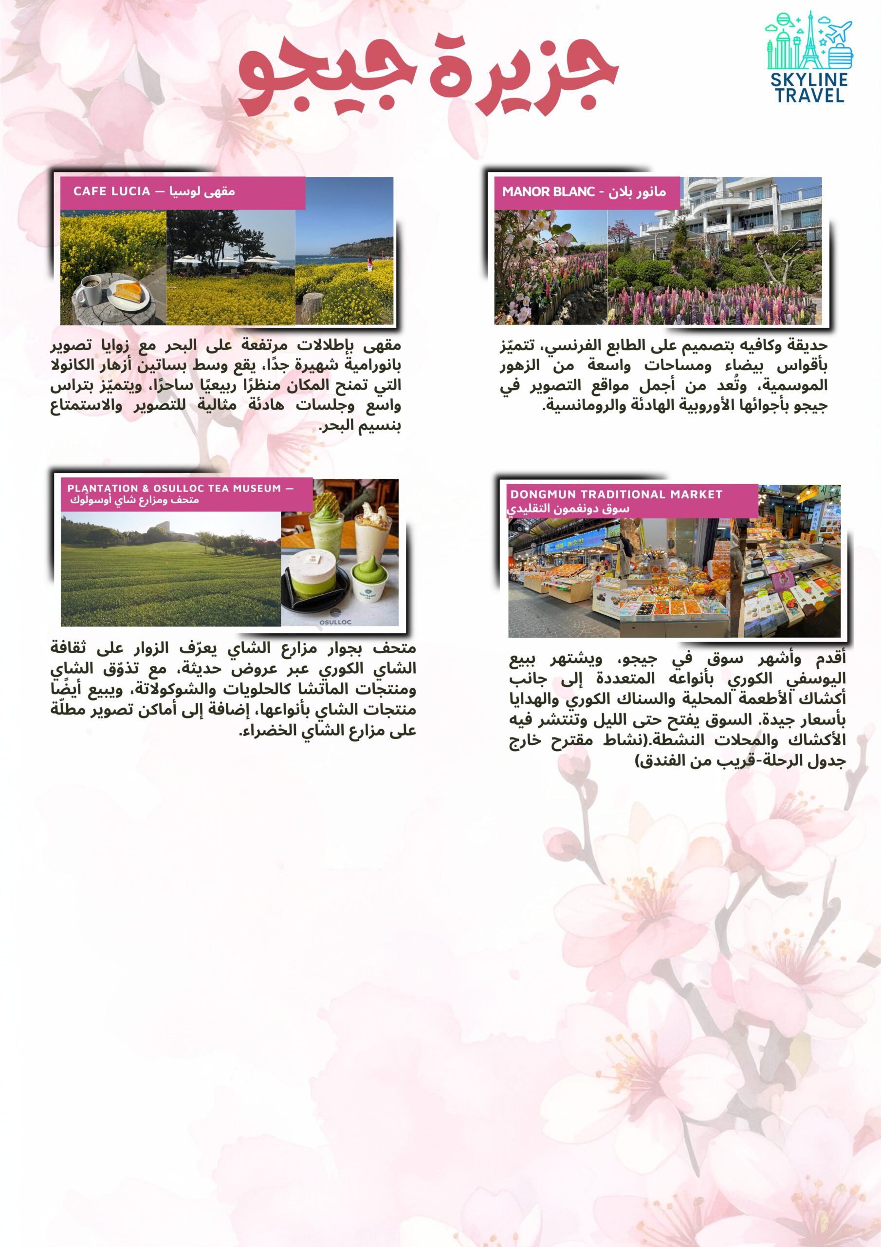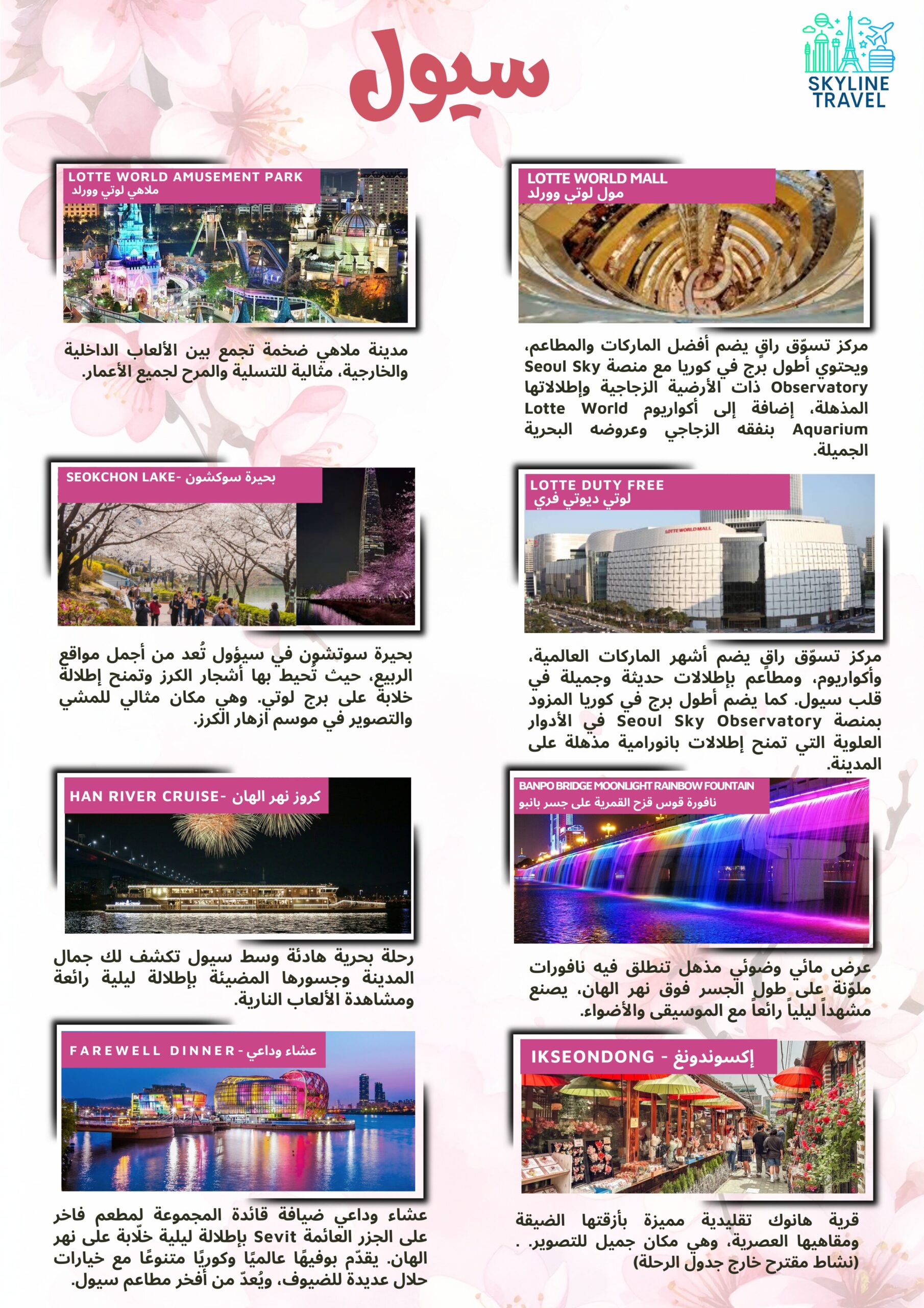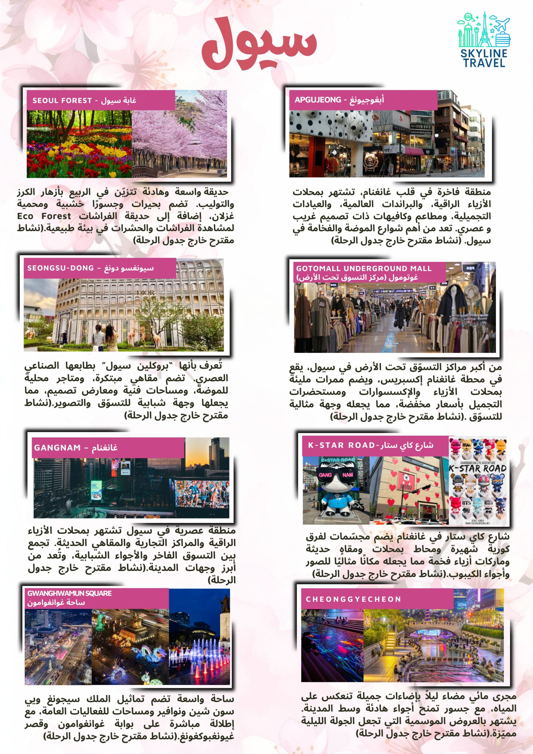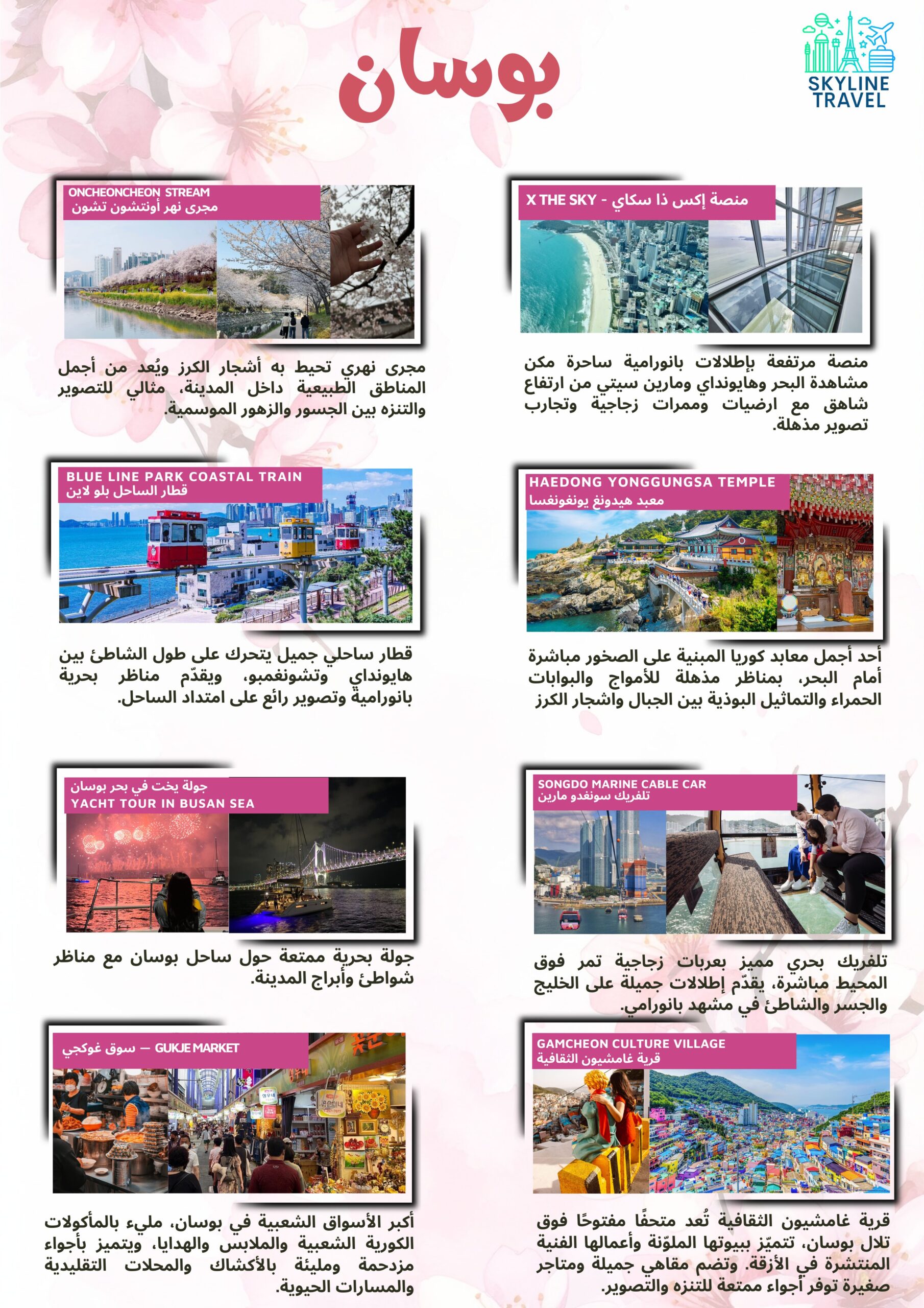 اكتشفوا جمال كوريا في فصل الربيع واستمتعوا بسحر الطبيعة الكورية، وأشجار الكرز المتفتّحة، والمغامرات والتجارب الفريدة التي ستصنع لكِ ذكريات لا تُنسى.